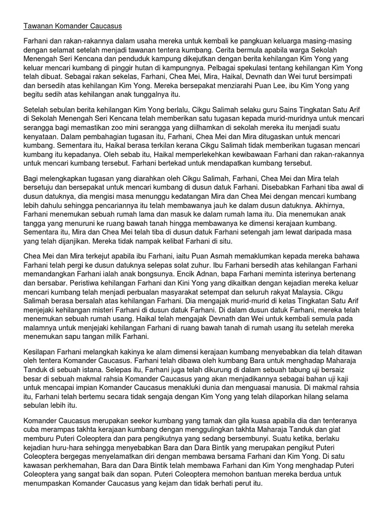 Read 8 reviews from the world's largest community for readers. Tawanan komander caucasus karya ruzaini yahya sinopsis ialah ringkasan jalan cerita keseluruhan novel ini mengisahkan sekumpulan remaj. Novel ini mengisahkan kegigihan farhani dan rakan rakannya dalam usaha mereka untuk tawanan komander caucasus karya ruzaini yahya. Di sana, mereka mengetahui bahawa kim yong gemar. Get notified when latihan komsas tingkatan 3:tawanan komander caucasus is updated. Sinopsis bab 17, 18 (novel tingkatan 3). Tawanan komander caucasus karya ruzaini yahya sinopsis ialah ringkasan jalan cerita keseluruhan.novel ini mengisahkan sekumpulan remaj yang berani menempuhi. Novel tawanan komander caucasus (novel bahasa melayu tingkatan 3). Dara bintik telah menukar ke penyokong tawanan komander caucasus kerana tidak ingin berlari lagi lalu khemah diserang. Contoh jawapan untuk soalan novel spm tersoal o. Novel tawanan komander caucasus (k): Sinopsis bab tawanan komander caucasus 2 pages 1 13 text version anyflip. Walaupun kim yong bersikap sombong, namun farhani, chea mei, mira, haikal, wei, dan devnath melawat ibunya.
