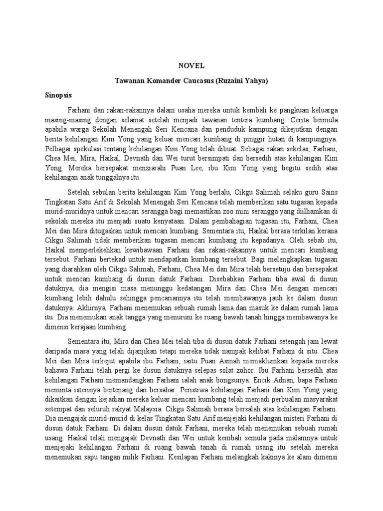 Sinopsis novel tawanan komander caucasus dalam subjek. Read 8 reviews from the world's largest community for readers. Sinopsis, tema, persoalan, nilai, pengajaran, gaya bahasa, plot, teknik plot, watak dan perwatakan, latar tempat, latar masa, latar masyarakat, soalan + jawapan : Tawanan komander caucasus karya ruzaini yahya sinopsis ialah ringkasan jalan cerita keseluruhan.novel ini mengisahkan sekumpulan remaj yang berani menempuhi cabaran untuk kembali ke dimensi manusia, setelah ditawan oleh kumbang yang zalim. Posted on january 3, 2019 by adenium2.