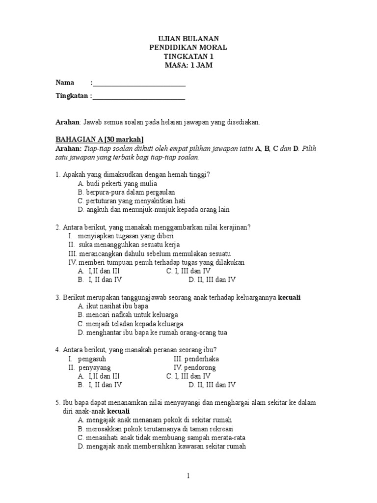 Pendidikan Moral Tingkatan 1 - 3 - We are a sharing community.. Bahagian a (20 markah) hitamkan huruf a, b, c atau d yang memberi jawapan yang betul. Pilih jawapan dibawah berkaitan kepentingan mempelajari moral dan lengkapkan peta dakap di bawah: Please fill this form, we will try to respond as soon as possible. Dskp pend moral tingkatan 1. Moral berasal daripada perkataan latin 'mores' yang membawa maksud.