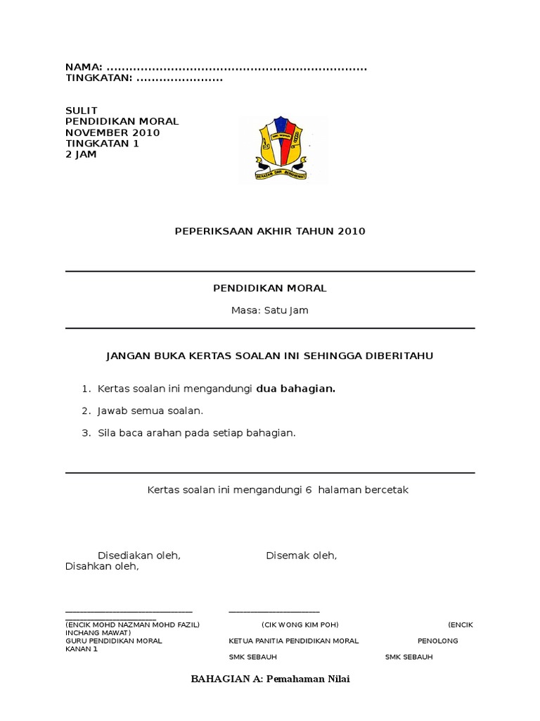 Soalan Pertengahan Tahun Pendidikan Moral Tingkatan 1 E Perkhidmatan from e-perkhidmatan.com Moral berasal daripada perkataan latin 'mores' yang membawa maksud. Untuk makluman bersama, soalan peperiksaan ini adalah berdasarkan kurikulum sekolah menengah yang baharu bagi tingkatan 1 iaitu kurikulum standard sekolah menengah (kssm). sebarang sumbangan bahan pendidikan, masalah, aduan, keperluan dan perkara berkaitan laman web (website) boleh hubungi kami di emel helpdesk@sumberpendidikan.com / sumberpendidikanguru@gmail.com. Previous articlebuku teks digital pendidikan jasmani dan kesihatan tingkatan 1. We are a sharing community. Pendidikan moral kssm tingkatan 1. Soalan ujian pendidikan moral tingkatan 3 via umiwish.blogspot.com. Lim seng didenda oleh gurunya kerana keluar kelas tanpa mendapat kebenaran.