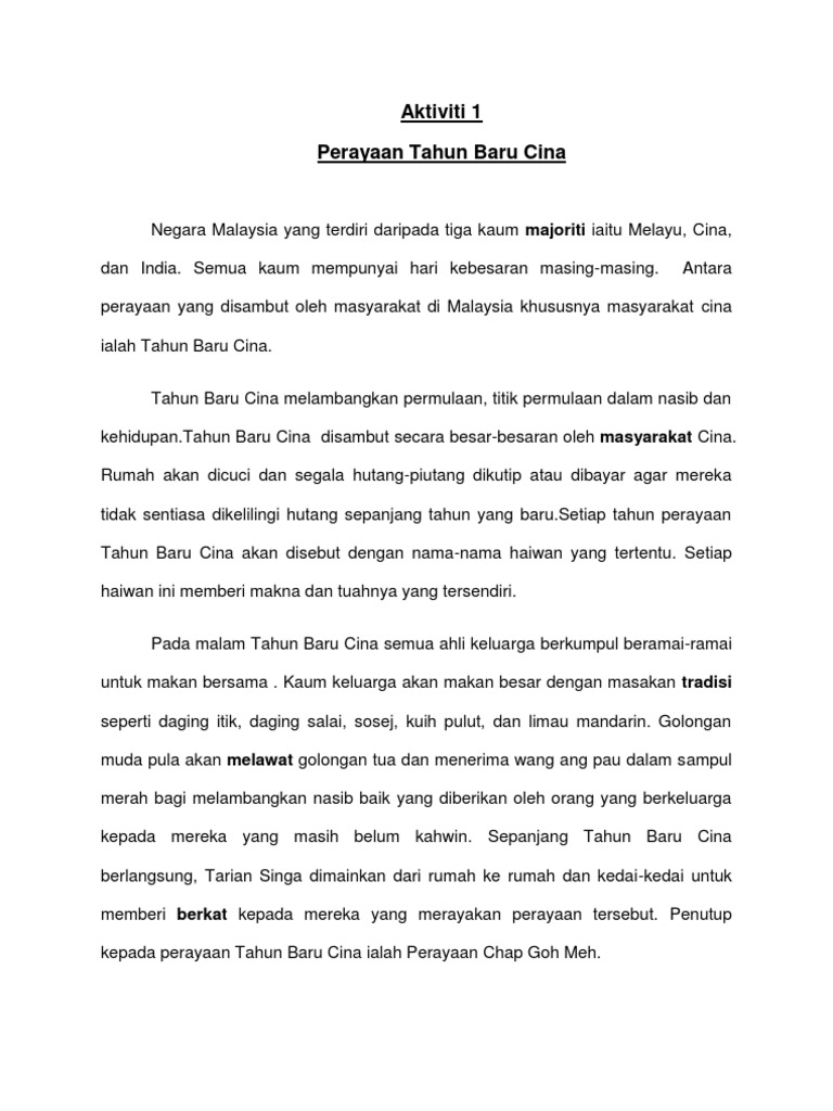 Dia juga membandingkan larangan perjumpaan keluarga dengan aktiviti pasar malam. Bertemakan tahun tikus, sambutan tahun baru cina pada tahun ini disertai oleh barisan maskot terbaharu sunway lagoon iaitu captain quack & friends di mana mereka akan bersama para pengunjung memeriahkan perayaan ini dari 23 januari sehingga 6 febuari 2020. Tahun 3 bahasa cina buku aktiviti (jilid 1) previous. Tahun baru cina 2021 bakal tiba kurang sebulan lagi! Destinasi melancong yang paling best adalah duduk kat rumah.hehe kalau sis la. Perayaan tahun baharu cina juga dipanggil tahun baru lunar dan dirayakan juga sebagai festival musim bunga. Semoga di tahun ini setiap lembaran memiliki makna, setiap lembaran bermanfaat. Permainan yoyo cina berasal dari negara cina. Kenapa berat badan mudah bertambah semasa perayaan tahun baru. Bagi mereka yang meraikannya, sambutan ini boleh menjadi sibuk dan penuh keseronokan dengan dikelilingi pelbagai hidangan makanan. Selamat tahun baru imlek 2021. Mereka mendapat 'ang pao' (sampul merah yang berisi wang) daripada ibu bapa dan saudara mara. Aktiviti pengukuhan (ms 13) :
