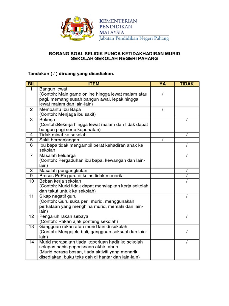 Tugasan bagi setiap mata pelajaran berbeza mengikut kohort (contoh: Doc borang soal selidik pengurusan ponteng sekolah dan pengaruhnya terhadap masalah ponteng dalam kalangan pelajar sekolah rendah di daerah kota belud evy ang academia edu. Related posts to contoh borang soal selidik disiplin pelajar 14 contoh borang soal selidik disiplin pelajar 14 2016 11 11t07 49 00 08 00 rating. Adakah kawan anda banyak beri galakkan untuk terus belajar? Free unlimited pdf search and download.